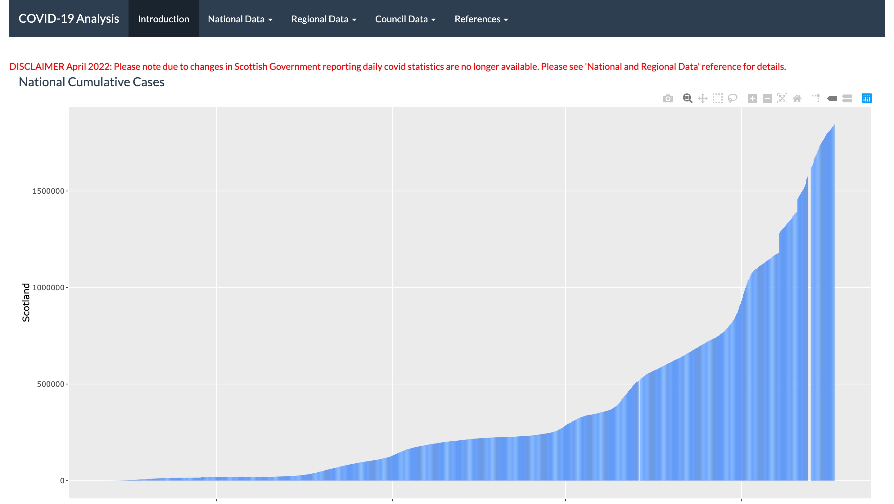 In 2020 the UK had been placed into lockdown due to the ongoing COVID-19 pandemic. Like most people I suddenly had some free time of my hands and wanted to try and do something productive. I was relatively new to coding in R and had never made an R shiny application before. I knew that the Scottish COVID-19 statistics were released publicly on a daily basis and I thought it would be a good idea to try and make an R Shiny application that used these data sets.