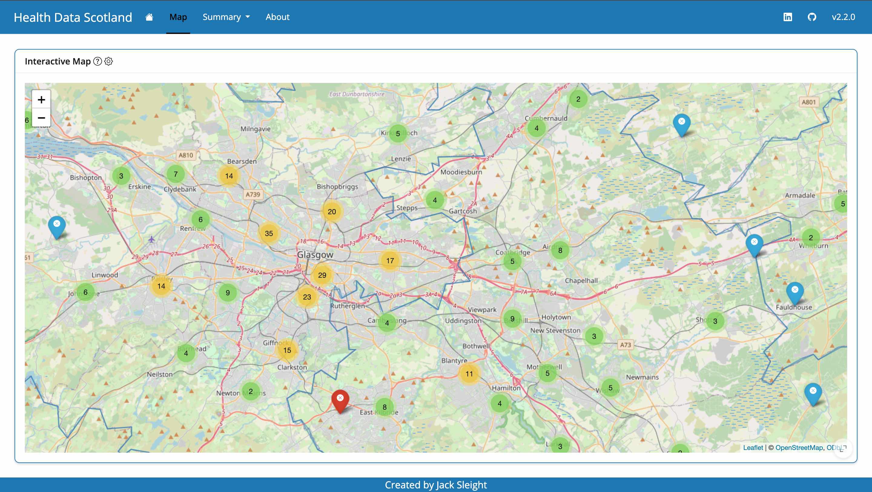 As previously mentioned, I have tried to design the underlying R package to be generic enough to handle different health care centres and present them appropriately in the app. Currently HealthDataScotland only presents GP practices and hospitals. However one could imagine future versions of the app presenting the location of other health care settings such as dental practices or pharmacies.